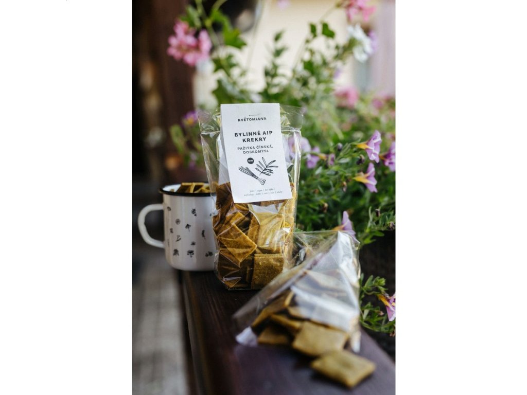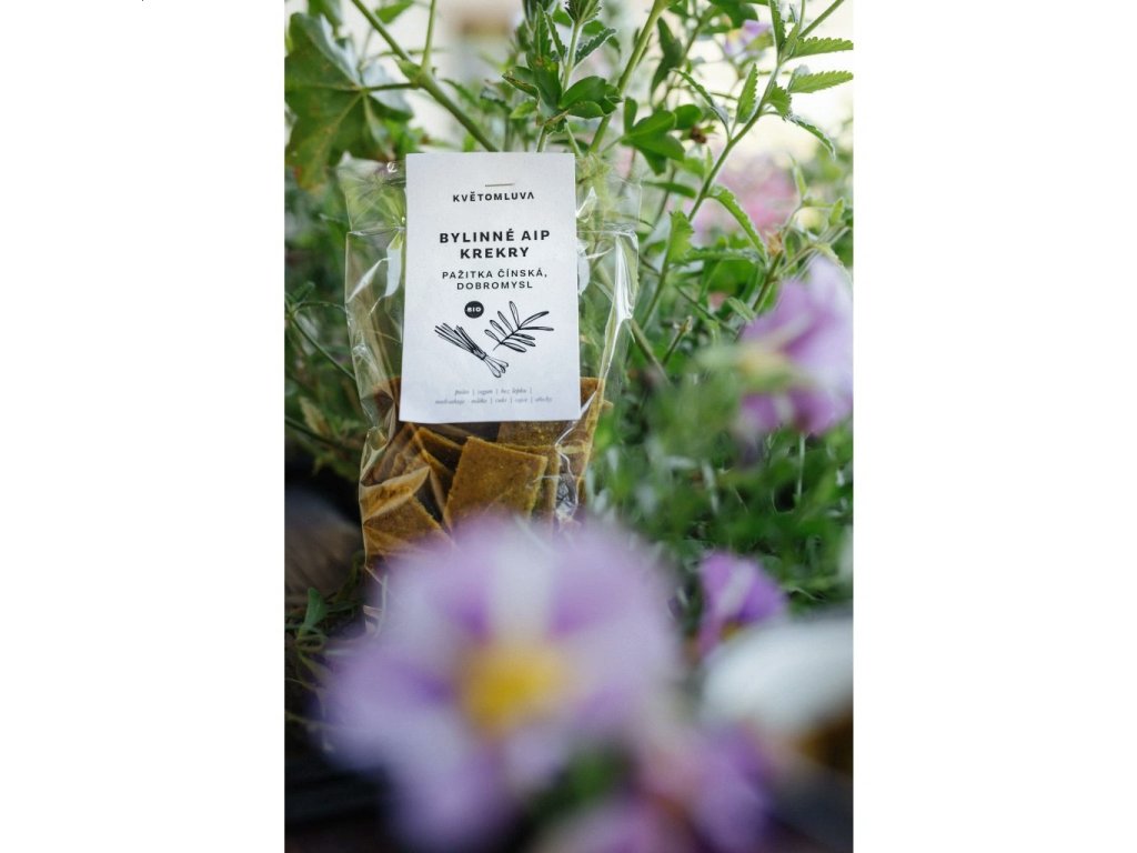 KVĚTOMLUVA Bio bylinné krekry AIP - dobromysl, pažitka - expirace 9/2025 - sleva 15 %